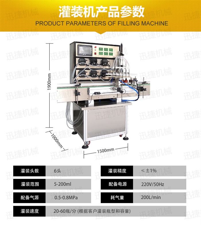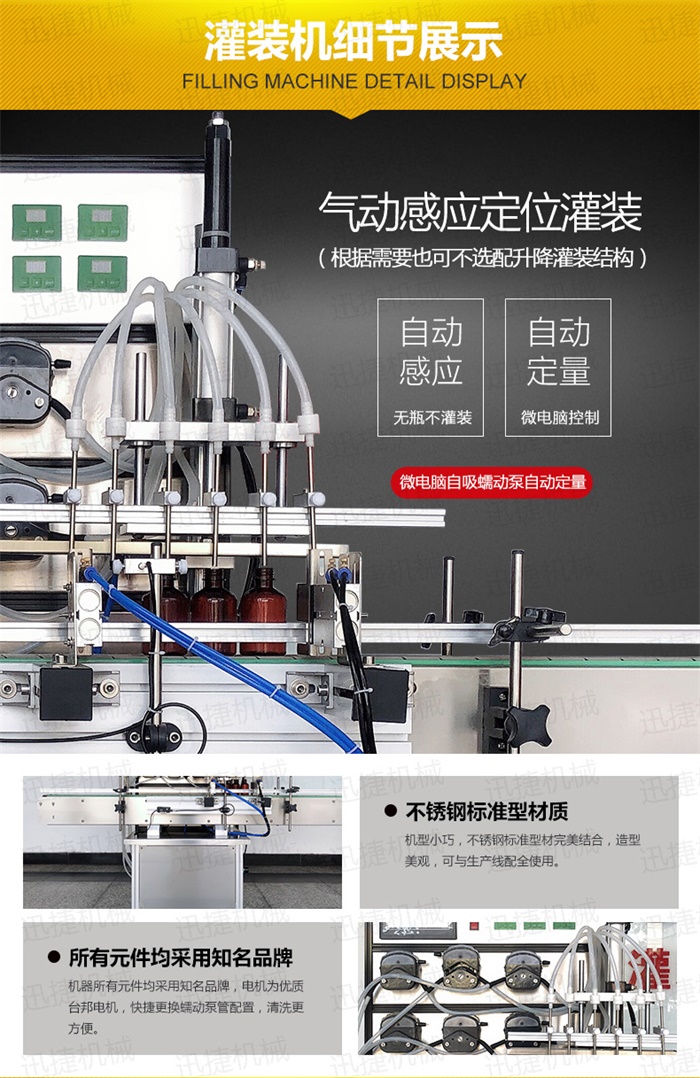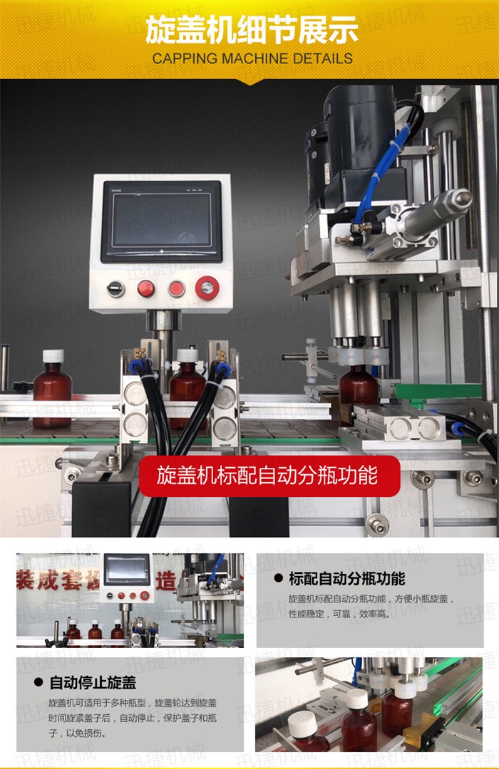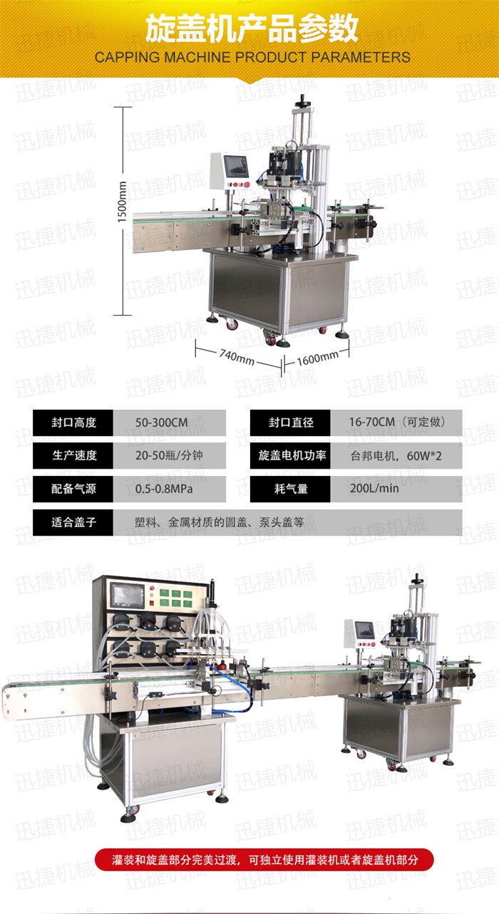 工作流程:液體灌裝頭自動定位定量灌裝,機器灌裝完成1-10升的灌裝,隨即進入下一個工位,震盤自動理蓋,自動上蓋,自動旋緊瓶蓋。整個生產過程只需要人工放空桶。提升工作效率,降低勞動強度。