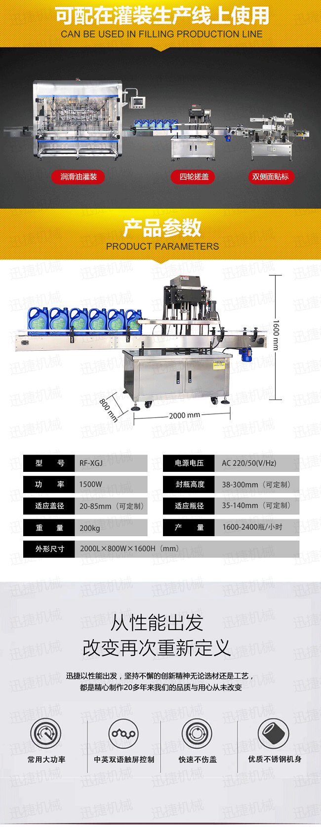 全自動旋蓋機是參照國機型改進設計、旋蓋速度快,合格率高、操作方便。可適用于食品、制藥、日化、農(nóng)藥、化妝品等行業(yè)的不同瓶形的旋蓋。四臺調(diào)速電機分別用于供蓋、夾瓶、傳送、旋蓋,機器自動化程度高,穩(wěn)定性好,調(diào)節(jié)方便,更換瓶形或蓋時無須備件,只需作調(diào)整即可完成(如配上蓋機,可進行自動上蓋)可以根據(jù)實際需要選配。