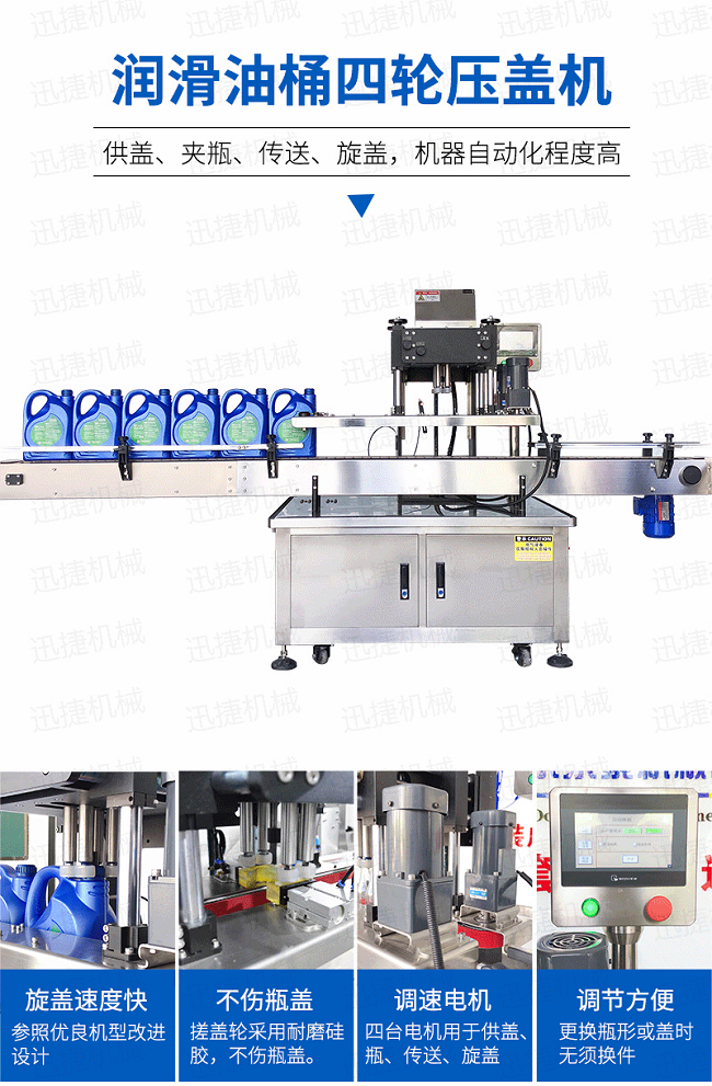 全自動旋蓋機是參照國機型改進設計、旋蓋速度快,合格率高、操作方便。可適用于食品、制藥、日化、農(nóng)藥、化妝品等行業(yè)的不同瓶形的旋蓋。四臺調(diào)速電機分別用于供蓋、夾瓶、傳送、旋蓋,機器自動化程度高,穩(wěn)定性好,調(diào)節(jié)方便,更換瓶形或蓋時無須備件,只需作調(diào)整即可完成(如配上蓋機,可進行自動上蓋)可以根據(jù)實際需要選配。