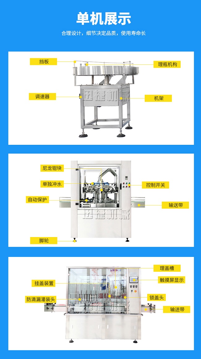 本灌裝流水線設(shè)備具有穩(wěn)定可靠、自動(dòng)化水平高,相比同類產(chǎn)品有著更長的使用年限,維護(hù)簡單,整線中各設(shè)備的協(xié)調(diào)性、連貫性強(qiáng),整線設(shè)計(jì)合理等特點(diǎn)。灌裝設(shè)備采用系統(tǒng)結(jié)構(gòu),為當(dāng)今行業(yè)內(nèi)水平,整線滿足量產(chǎn)化、集成化生產(chǎn)的需要。