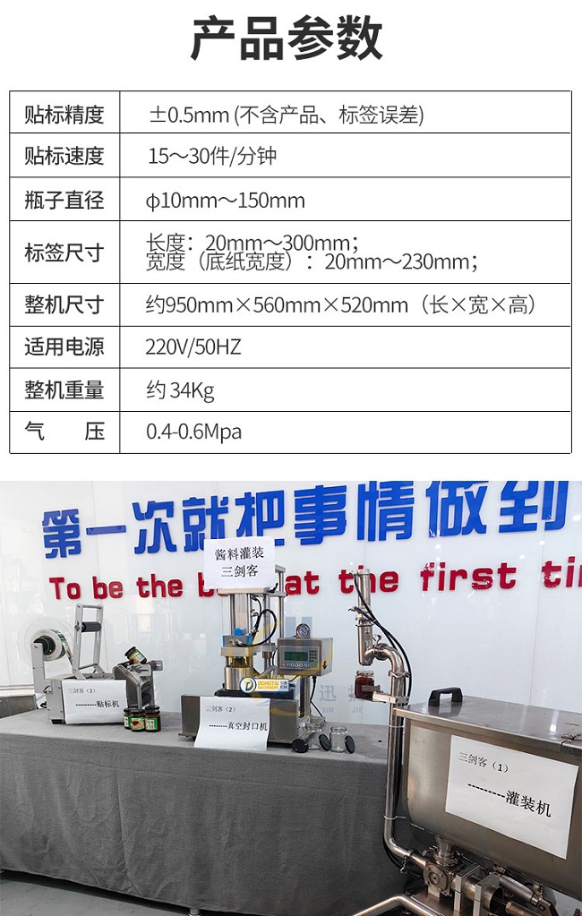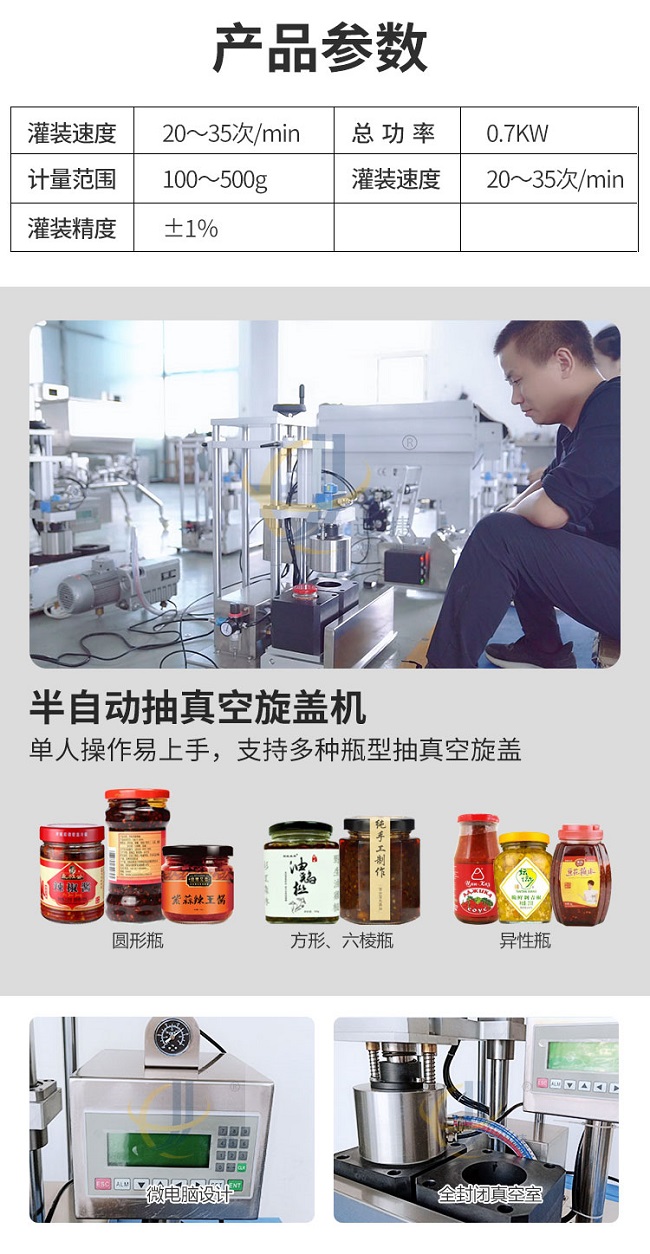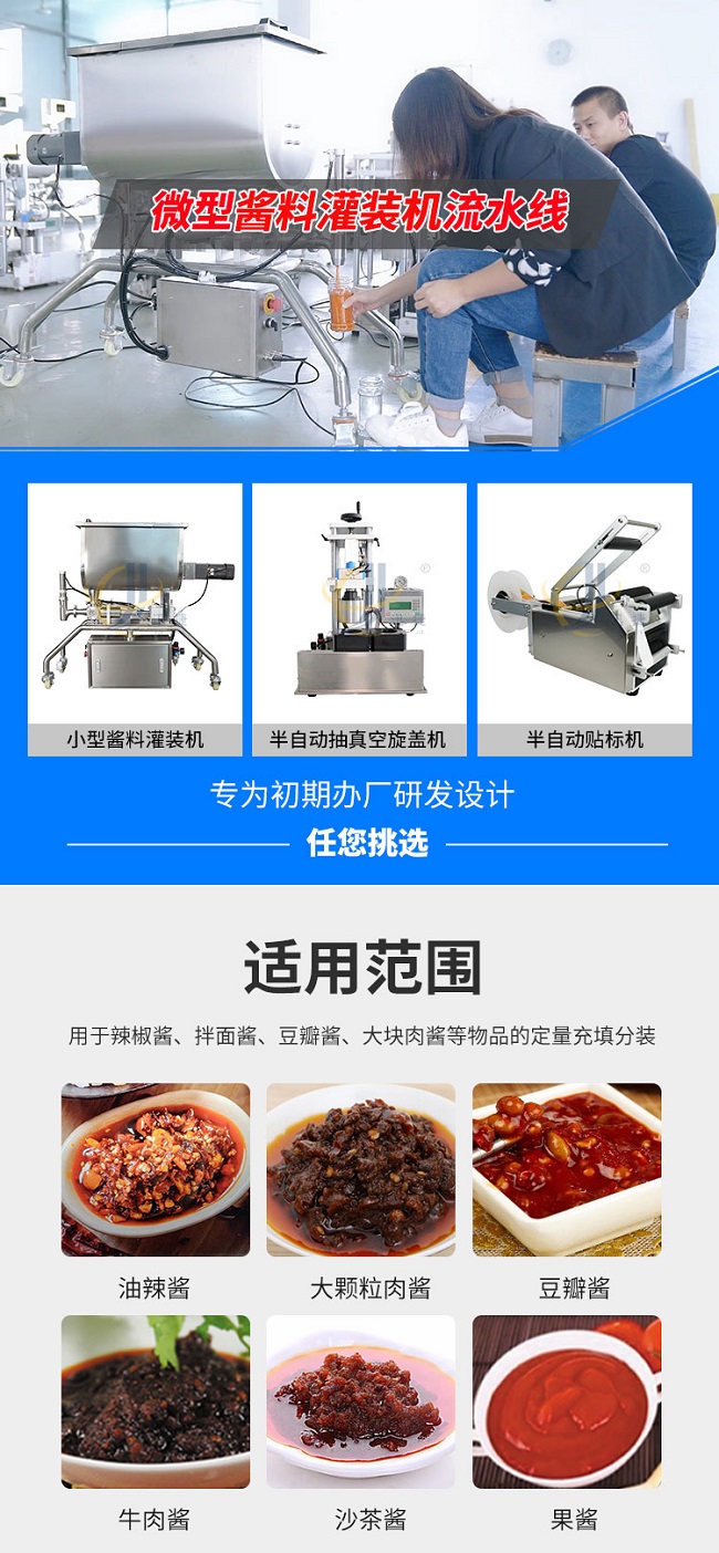 我公司新研發(fā)小型醬料灌裝生產(chǎn)線(xiàn),包含三款小設(shè)備,小型醬料灌裝機(jī)、半自動(dòng)抽真空旋蓋機(jī)、半自動(dòng)貼標(biāo)機(jī)、該小型醬料生產(chǎn)線(xiàn)專(zhuān)為初期辦廠研發(fā)設(shè)計(jì),適用于辣椒醬、拌面醬、豆瓣醬、大塊醬等醬料的定量灌裝,該產(chǎn)品支持定制,選用306不銹鋼材質(zhì),灌裝精度高,防止滴漏,選用plc觸屏智能控制,防滴漏防拉絲,突破傳統(tǒng)的灌裝方式,可根據(jù)瓶子高度調(diào)整灌裝頭高度,采用防滴漏設(shè)計(jì),灌裝時(shí)不滴不漏。