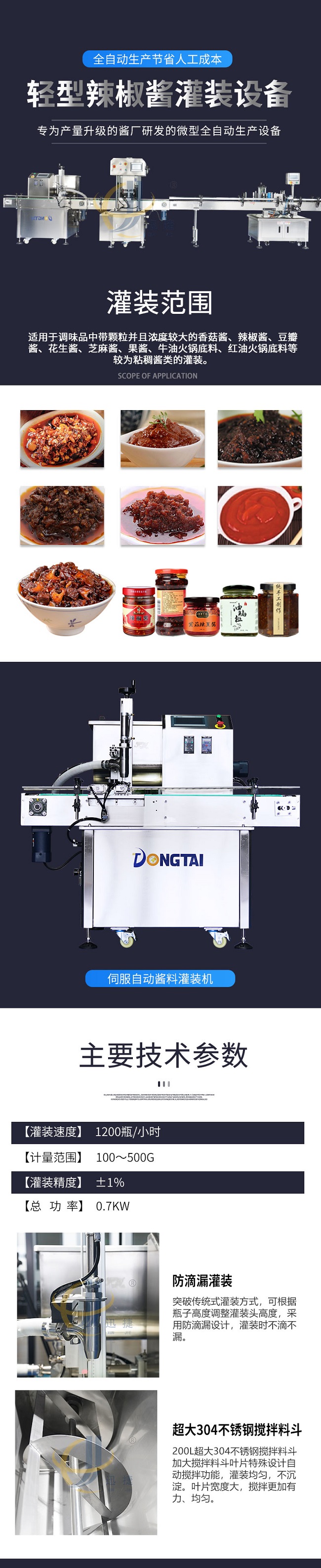 這款小型辣椒醬灌裝生產線是本公司專為產量升級的醬廠研發的微型全自動生產設備,適用于調味品中帶顆粒并且濃度較大的香菇醬、辣椒醬、豆瓣醬、花生醬、芝麻醬、果醬、牛油火鍋底料、紅油火鍋底料等較為粘稠醬類的灌裝。