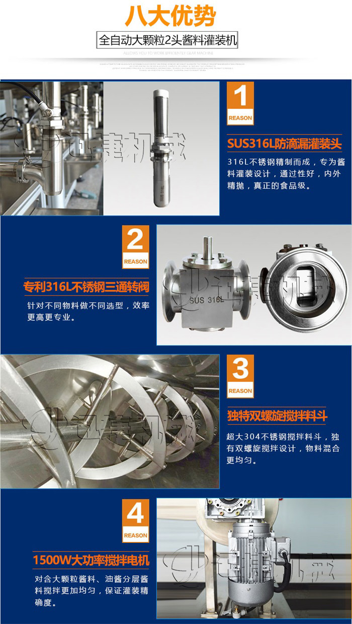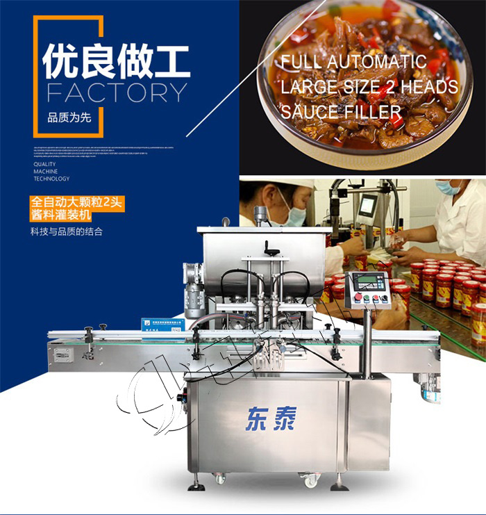 該系列灌裝機采用活塞式氣缸氣動原理,適用于調味品中帶顆粒并且濃度較大的香菇醬、辣椒醬、豆瓣醬、花生醬、芝麻醬、果醬、牛油火鍋底料、紅油火鍋底料等較為粘稠醬類的灌裝。灌裝轉閥可以很具客戶物料定做加大,以適應不同客戶物料的灌裝需求。配備臥式攪拌料斗,限度的保障在灌裝過程中物料均勻、無油醬分離,確保每一瓶的灌裝精確度,該設備在設計上大大縮短了下料斗到灌裝頭的灌裝距離,克服了含油量大的油料(如:含芝麻粒的辣椒油)在灌裝過程出現的有些瓶油多,有些瓶醬多的灌裝誤差大的缺點。