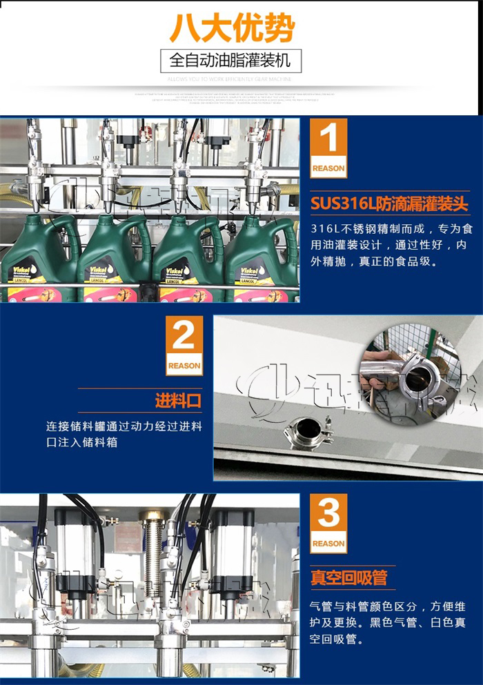 本機是根據潤滑油的特性而設計的一款全自動稱重式潤滑油灌裝機,該機設計緊湊合理,外形簡介美觀大氣,灌裝量調節方便,精度高。借鑒了歐美國家的灌裝流程控制技術,彩色觸摸屏人機界面,灌裝進程實現一鍵操作,性能穩定。采用兩個316儲油罐解決灌裝量大的問題,一個進油口控制兩個油箱的液位,一個儲油箱分別控制5個灌裝頭,速度更快,精度更高。