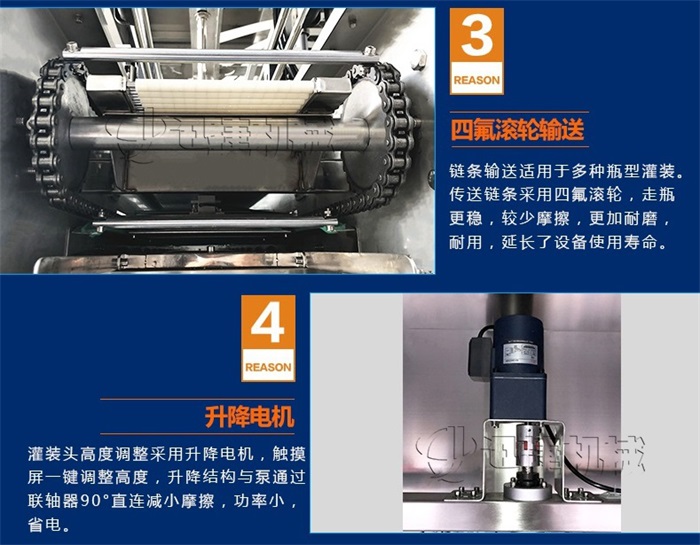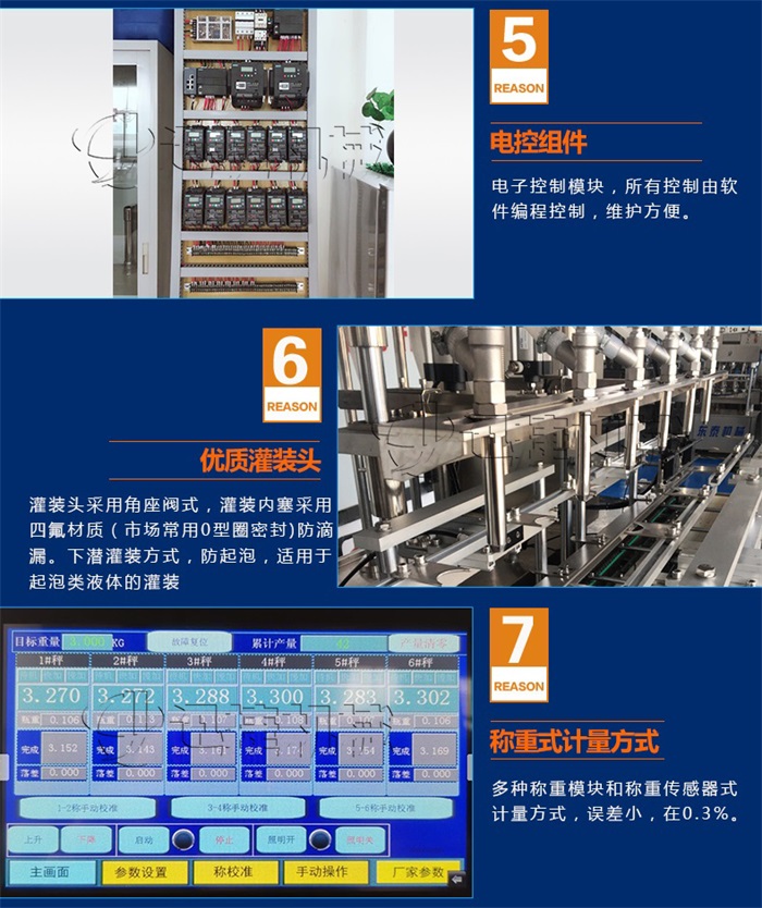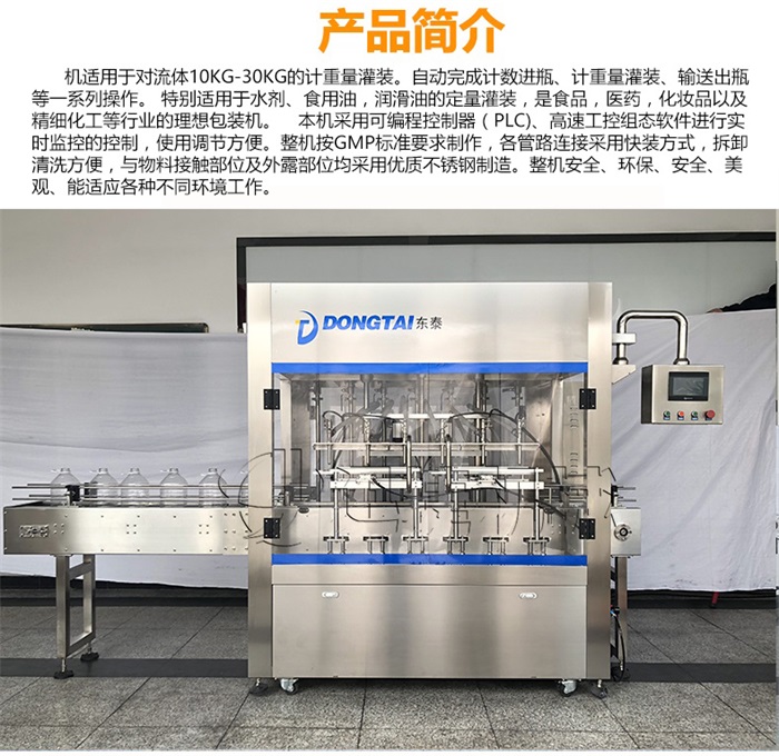 機適用于對流體5kg-30kg的計重量灌裝。自動完成計數進瓶、計重量灌裝、輸送出瓶等一系列操作。 特別適用于水劑、食用油,潤滑油的定量灌裝,是食品,醫藥,化妝品以及精細化工等行業的包裝機。本機采用可編程控制器(PLC)、高速工控組態軟件進行實時監控的控制,使用調節方便。整機按GMP標準要求制作,各管路連接采用快裝方式,拆卸清洗方便,與物料接觸部位及外露部位均采用優質不銹鋼制造。整機安全、環保、安全、美觀、能適應各種不同環境工作。